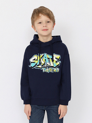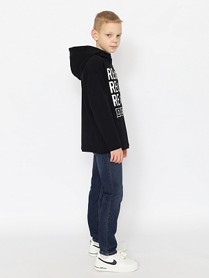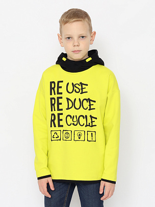 Толстовка с длинными рукавами, притачными планками по низу изделия и рукава. Капюшон с подкладкой и декоративным шнурком. Перед декорирован принтом "Перерабатывай и используй повторно".