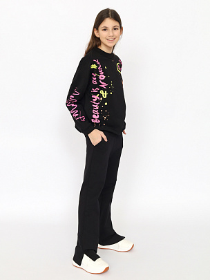 Джемпер для девочки с трендовым принтом "Красота вокруг, будь творческим, вдохновляй", выполнен из мягкого футера на основе хлопка, который прост в уходе, хорошо пропускает воздух и комфортен в носке. Крой оверсайз с заниженной линией плеча не сковывает движения, позволяя ребенку быть активным. Модель дополнена круглым воротником и длинными рукавами. Горловина, манжеты и низ оформлены рельефной резинкой.