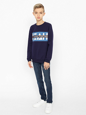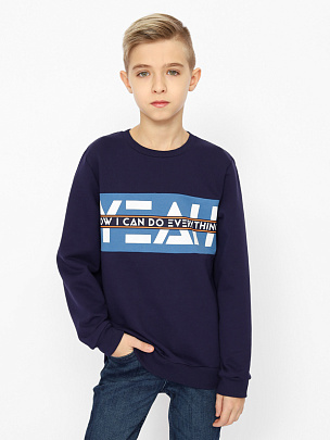 Джемпер для мальчика с длинными рукавами и притачным поясом. Воротник, манжеты и пояс выполнены из полотна с эластаном. Перед и спинка джемпера со вставками контрастного цвета. Вставки декорированы принтами. На пояс спереди настрочена декоративная жаккардовая этикетка.