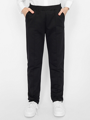 Брюки с притачным поясом из основного полотна и резинкой внутри. На передних половинках расположены карманы и отстроченные стрелки.