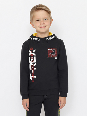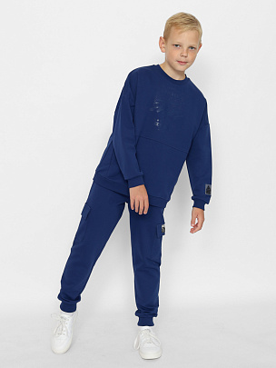 Брюки для мальчика с накладными карманами с клапаном. Нижние срезы брюк оформлены притачными манжетами из полотна с эластаном. Пояс притачной, с резинкой и функциональным шнуром. На карман настрочена декоративная жаккардовая этикетка.