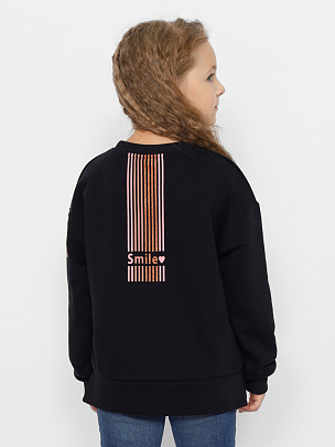 Джемпер для девочки с модным принтом на спинке и нашивкой на рукаве (надпись: "Улыбнись. Настоящий друг всегда в твоем сердце"). Крой оверсайз с заниженной линией плеча, не сковывает движения, позволяя ребенку быть активным. Модель дополнена круглым вырезом горловины и длинными рукавами. Воротник и манжеты выполнены из полотна с эластаном. В боковых швах по низу изделия разрезы.