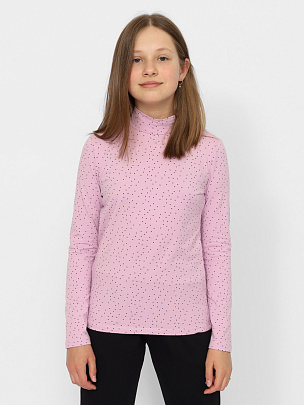 Джемпер для девочки с длинными рукавами и отложным воротником из кулирки, свободного силуэта. Рукава объемные, со спущенным плечом, снизу манжет из кулирки. Спинка с вырезом-капелькой и застёжкой на пуговицу-бусину с петлёй.