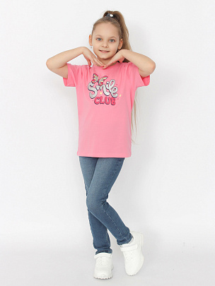 Футболка с коротким рукавом. Горловина круглая, обработана узким воротником из полотна с эластаном. Перед оформлен принтом с использованием краски с эффуктом "металлик".