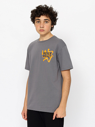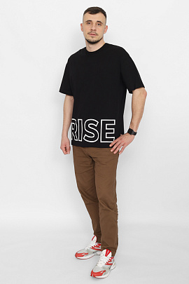 Футболка oversize со спущенным плечом, с коротким рукавом. Горловина круглая, обработана притачной бейкой из рибаны с лакрой. Плечевые швы смещены на перед и отстрочены. По переду вдоль правого бокового шва - текстовый принт.