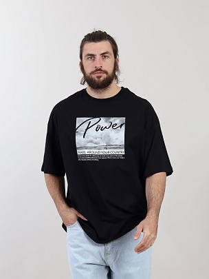 Футболка oversize со спущенным плечом, с коротким рукавом. Горловина круглая, обработана притачной бейкой из рибаны с лакрой. Плечевые швы смещены на перед и отстрочены. По переду вдоль правого бокового шва - текстовый принт.