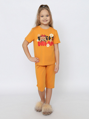 Футболка прямого силуэта с короткими рукавами. Горловина круглая, обработана притачной бейкой из рибаны с лайкрой. Перед футболки декорирован принтом с использованием глиттера.